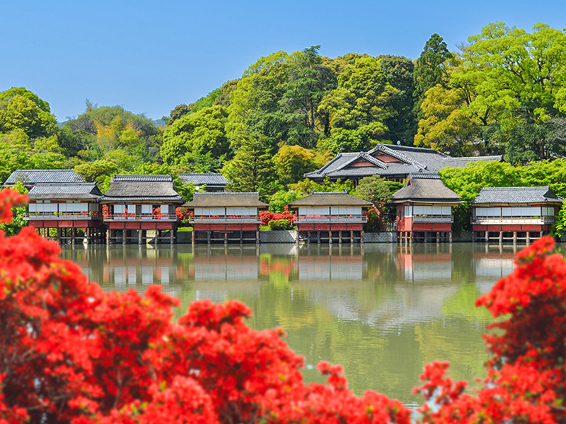 赤い欄干の橋に、重厚な唐破風の玄関。