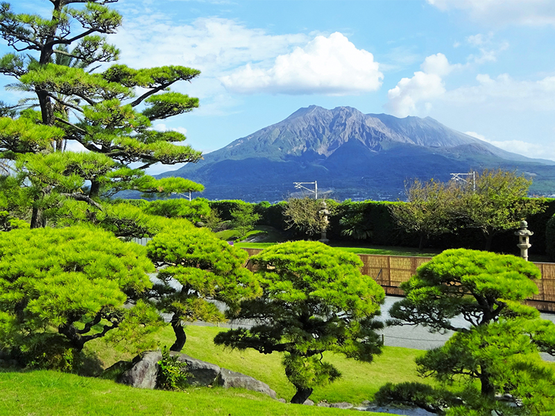 雄大な火山が絶景の大名庭園、