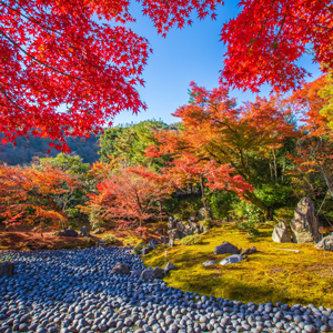 【宝厳院】錦秋が包む名庭を特別貸切、静かな朝に訪れた紅葉絵巻 ~朱に燃える障壁画、通常非公開の書院から獅子吼の庭を望む~